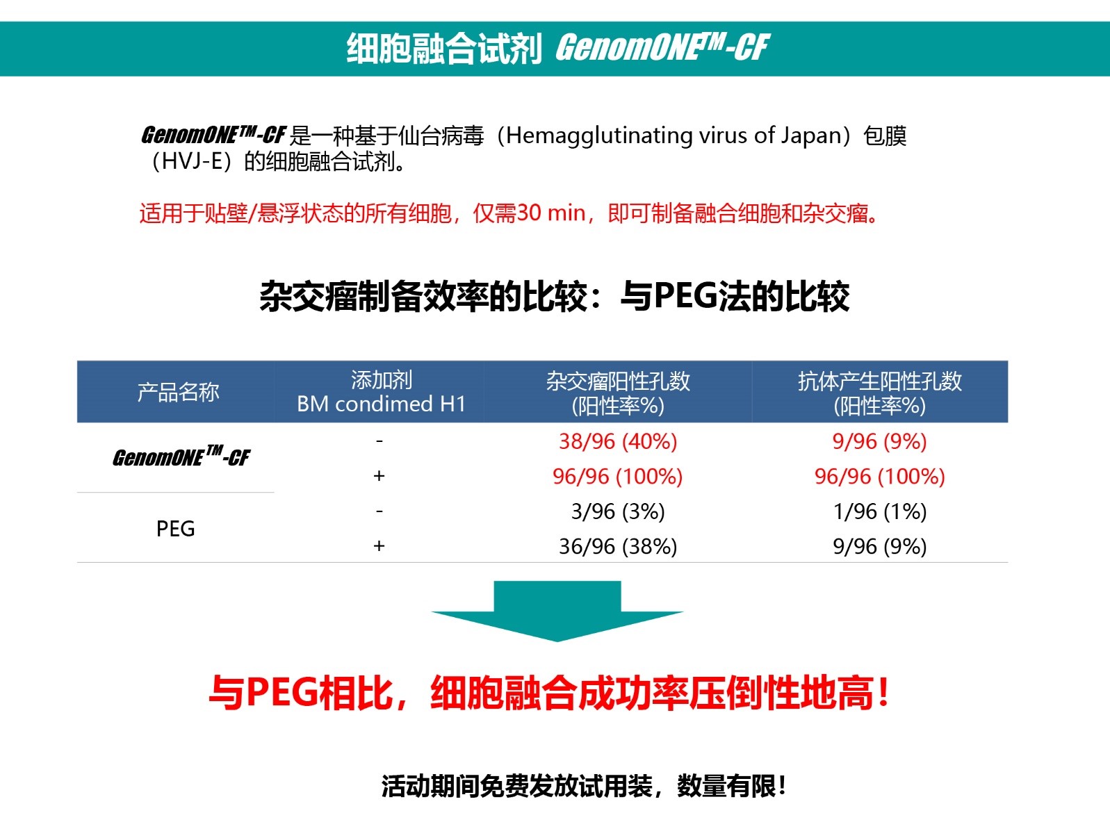GenomONE?-CF,是一種基于仙臺病毒包膜(HVJ-E)的細胞融合試劑
